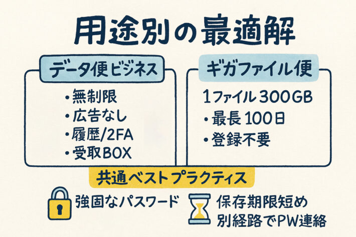 ビジネスで「広告なし・無制限・専門機能」を重視するならデータ便ビジネス、単発で「超大容量・長期保持」を重視するならギガファイル便が候補になります。