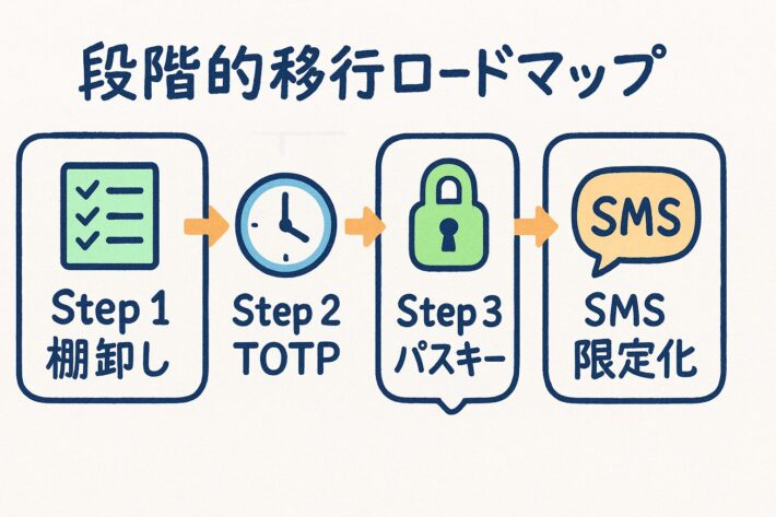 A. 段階的移行がおすすめです。まず管理画面はTOTP/パスキーを標準にし、一般ユーザーは併用期間を設けて徐々に移行します。リカバリー用にSMSを残す設計は現実的です。NISTの改訂4草案やFIDOの実装ガイドも、より強固な手段の普及を前提にしています。